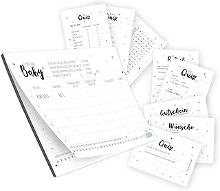 bigdaygraphix Babyparty Spiele-Set | 4 Verschiedene Spiele im Set + 20 Mama Gutscheine | bis zu 20 Personen | Baby & Mama Quiz + Rätselspiel + Stadt Land Fluss Spiel