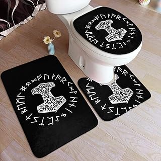 FETEAM Wikinger Mjolnir und Rune Wheel Norse Mythology Symbol Badmatten Set 3 Stück mit Rückenpolster Badematte + Kontur Teppich + WC-Deckel Abdeckung